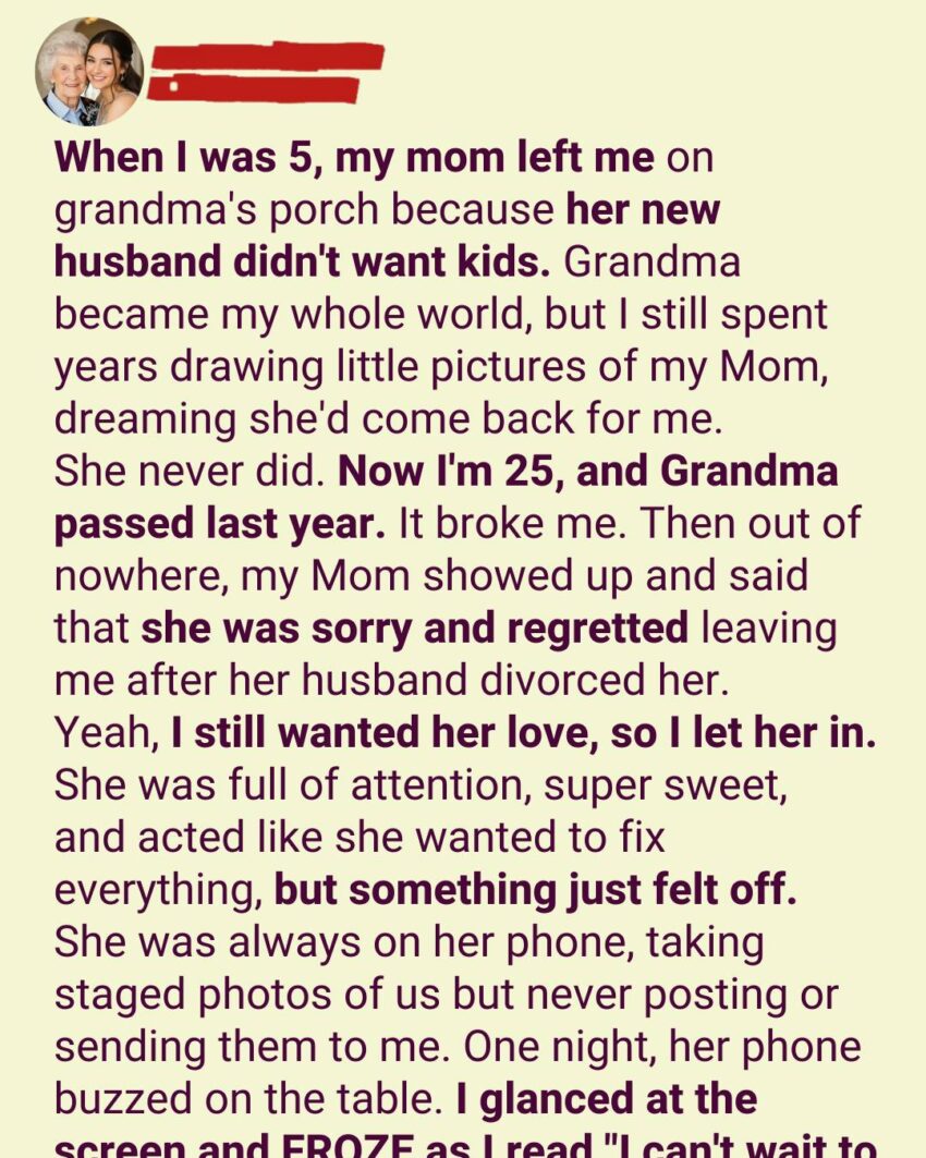At the time, I didn’t understand much. Mark—her new husband—had entered our lives a few years after my dad passed away. Even as a child, I could sense that he didn’t like me. But what I couldn’t comprehend was why we were standing on my grandmother’s porch—my dad’s mother—on a day that felt so final.