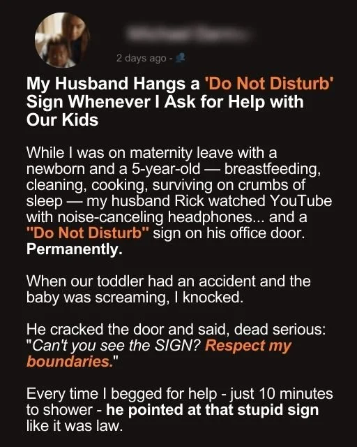 While I was on maternity leave with a newborn and a 5-year-old — breastfeeding, cleaning, cooking, surviving on crumbs of sleep — my husband Rick watched YouTube with noise-canceling headphones… and a “Do Not Disturb” sign on his office door. Permanently. When our toddler had an accident and the baby was screaming, I knocked.