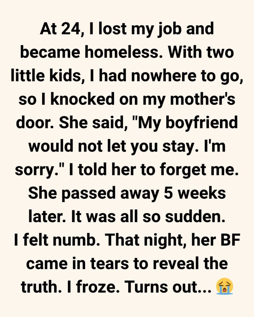 She opened it, looking thinner than I remembered, her eyes tired but still gentle. I told her everything in one breath — how I’d lost my job, how we’d been sleeping in the car, how I had nowhere else to go.