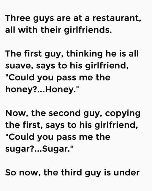 Three friends were dining out with their girlfriends when one tried to sound charming. “Could you pass me the honey… honey?” he said smoothly. Another followed with, “Could you pass me the sugar… sugar?” The third friend felt the pressure to be clever too, paused dramatically, and finally asked, “Could you pass me the pork… pig?” The table burst into laughter, and even nearby diners couldn’t help smiling.