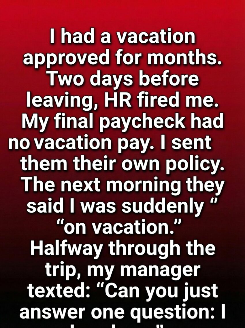 For months, Mara had counted down the days to her long-planned vacation. It wasn’t just a trip—it was a promise she had made to herself after years of overtime, skipped weekends, and quiet sacrifices. The approval email from HR sat neatly in her inbox, a small digital proof that her effort had finally earned rest. She imagined slow mornings, distant horizons, and the rare feeling of being unreachable. But two days before departure, everything changed. A brief meeting, a polite tone, and a carefully worded sentence ended her job. When her final paycheck arrived without the vacation pay she had earned, disappointment turned into determination.