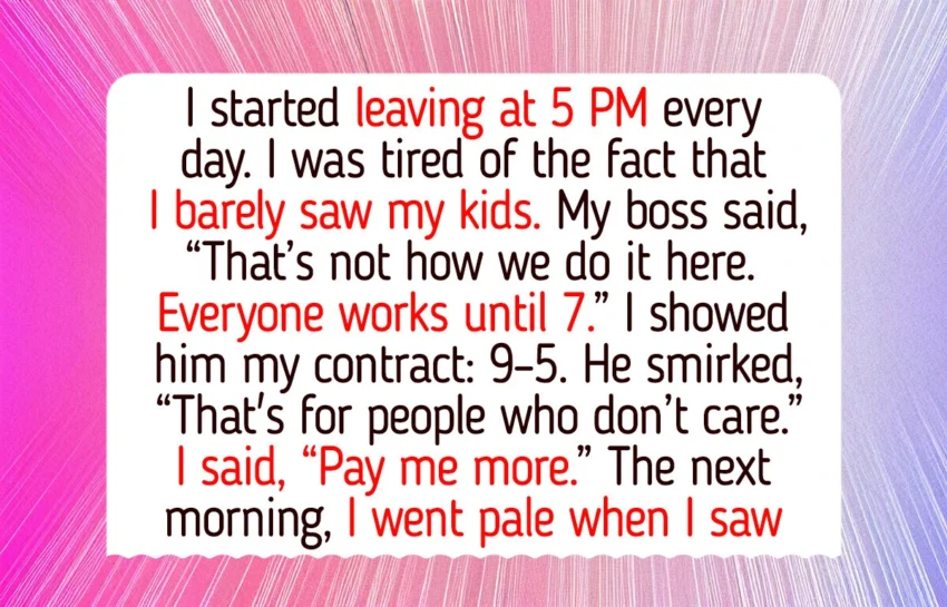 But then my boss pulled me aside: “That’s not how we do it here. Everyone stays until 6 or 7.” I said, “My contract says 9–5.” He snapped, “5 PM is for the uncommitted people who don’t care.” I replied, “Then pay me more.” He just smirked.