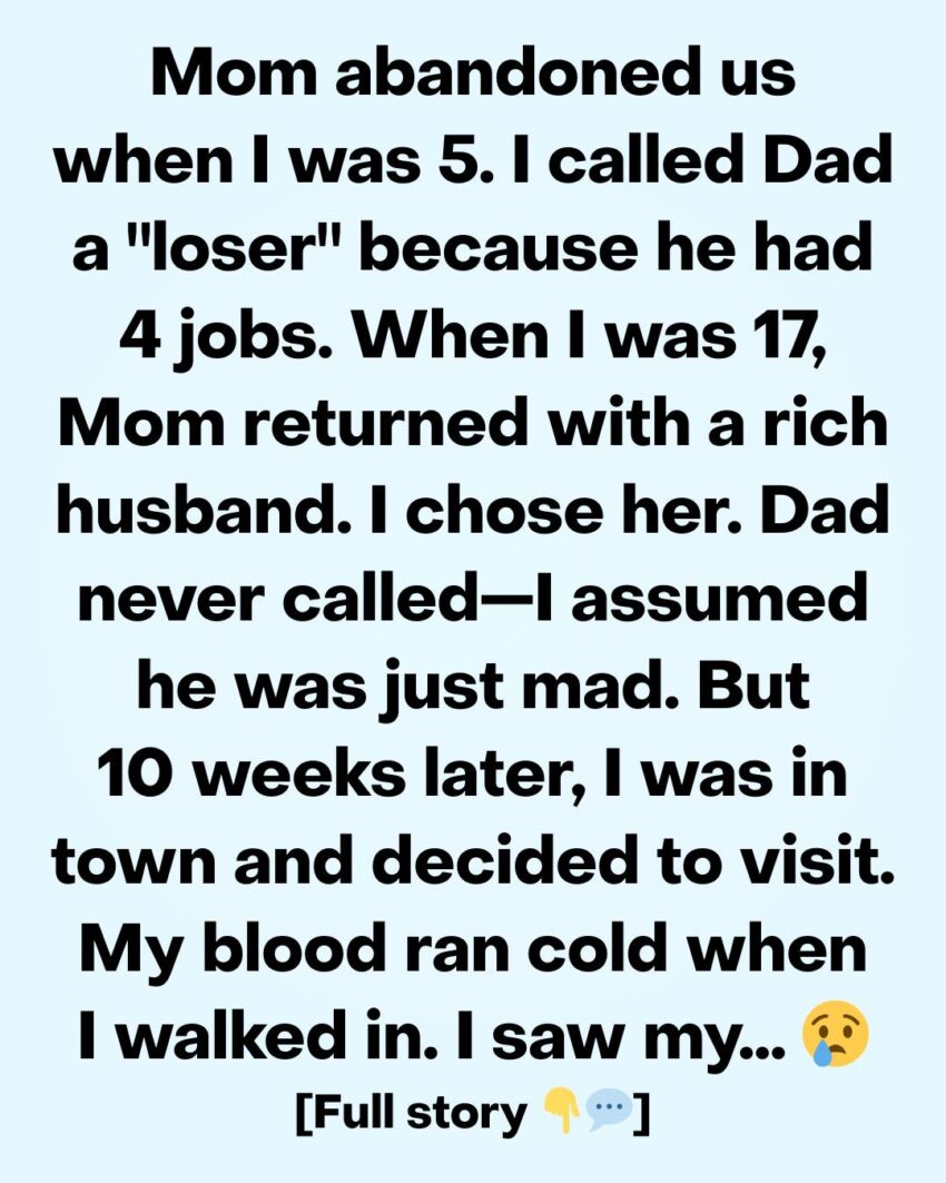 When I saw him, tubes everywhere, face pale and thinner than I remembered, my knees nearly gave out. I broke down, sobbing, begging him to forgive me for leaving. For choosing my mother. For calling him a loser.