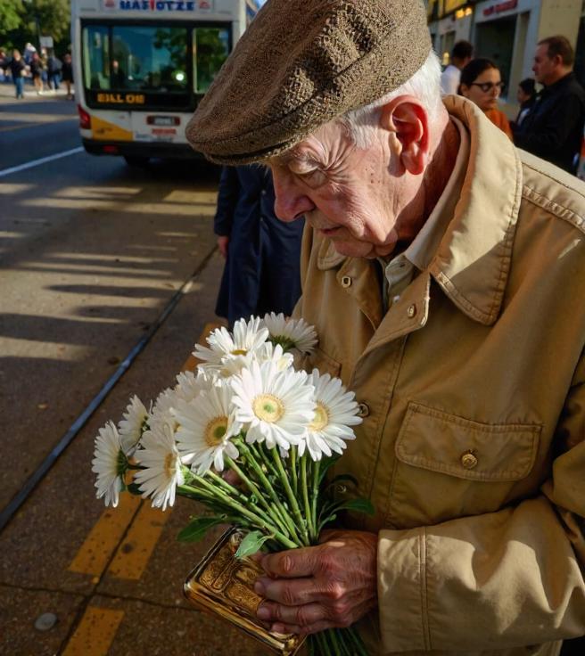 An elderly man stood near the curb, slightly hunched, holding a small bouquet of daisies wrapped in clear plastic. His coat was too big for his frame. The fabric had a worn, washed-too-many-times look, faded from what might’ve been navy to something closer to a sad blue-gray.