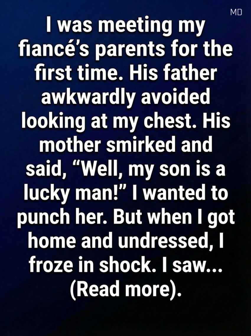 I was meeting my fiancé’s parents for the first time. His father awkwardly avoided looking at my chest. His mother smirked and said, “Well, my son is a lucky man!” I wanted to punch her. But when I got home and undressed, I froze in shock. I saw… the faint outline of a medical bandage peeking from beneath my dress — a reminder of the surgery I’d undergone just weeks before, something I hadn’t told anyone outside my closest circle. In that moment, embarrassment and anger melted into something else: fear that my private struggle had somehow become visible, exposed in ways I wasn’t ready to explain.