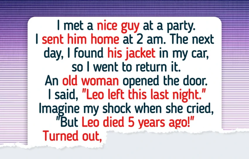 The next day, I found his jacket in my car, so I went to return it. An old woman opened the door. I said, “Leo left this last night.” Imagine my shock when she cried, “But Leo died 5 years ago!”
