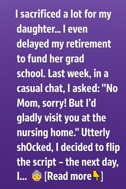 I tried to clarify, told her I never meant she’d have to change my diapers—I just hoped for some support. Even emotional. She doubled down: “No, Mom. The cycle of parental sacrifice doesn’t have to continue forever. I didn’t ask for it.” Then she chuckled and added, “But hey, I’d totally visit you at the nursing home!”