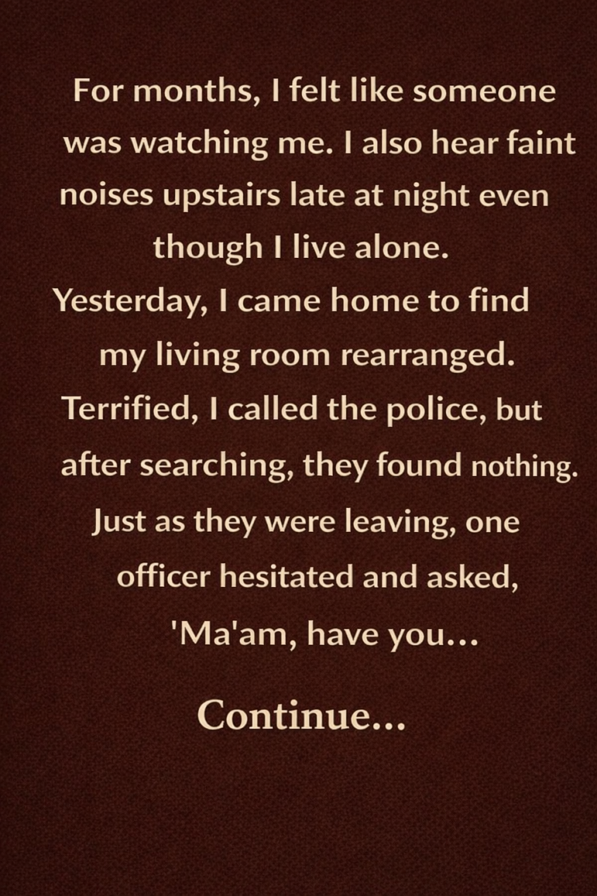 “For the past few months, I’ve been feeling like someone’s been watching me. It started small—little things like lights I was absolutely sure I had turned off being on again, doors slightly ajar when I knew I had closed them tightly. At first, I told myself it was just stress or forgetfulness, but then the sounds began.