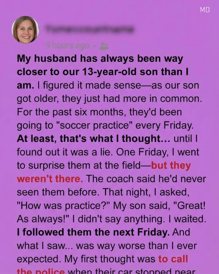 For years, I believed my husband and our thirteen-year-old son simply shared interests that I didn’t. They bonded over sports, weekend projects, and long conversations I was rarely part of. When they started leaving together every Friday evening for what they called soccer practice, I didn’t question it. It seemed natural that as our son grew older, he leaned more on his father. Still, a quiet distance formed between us, and sometimes I wondered if I was slowly being left out of an important part of his life without realizing it.