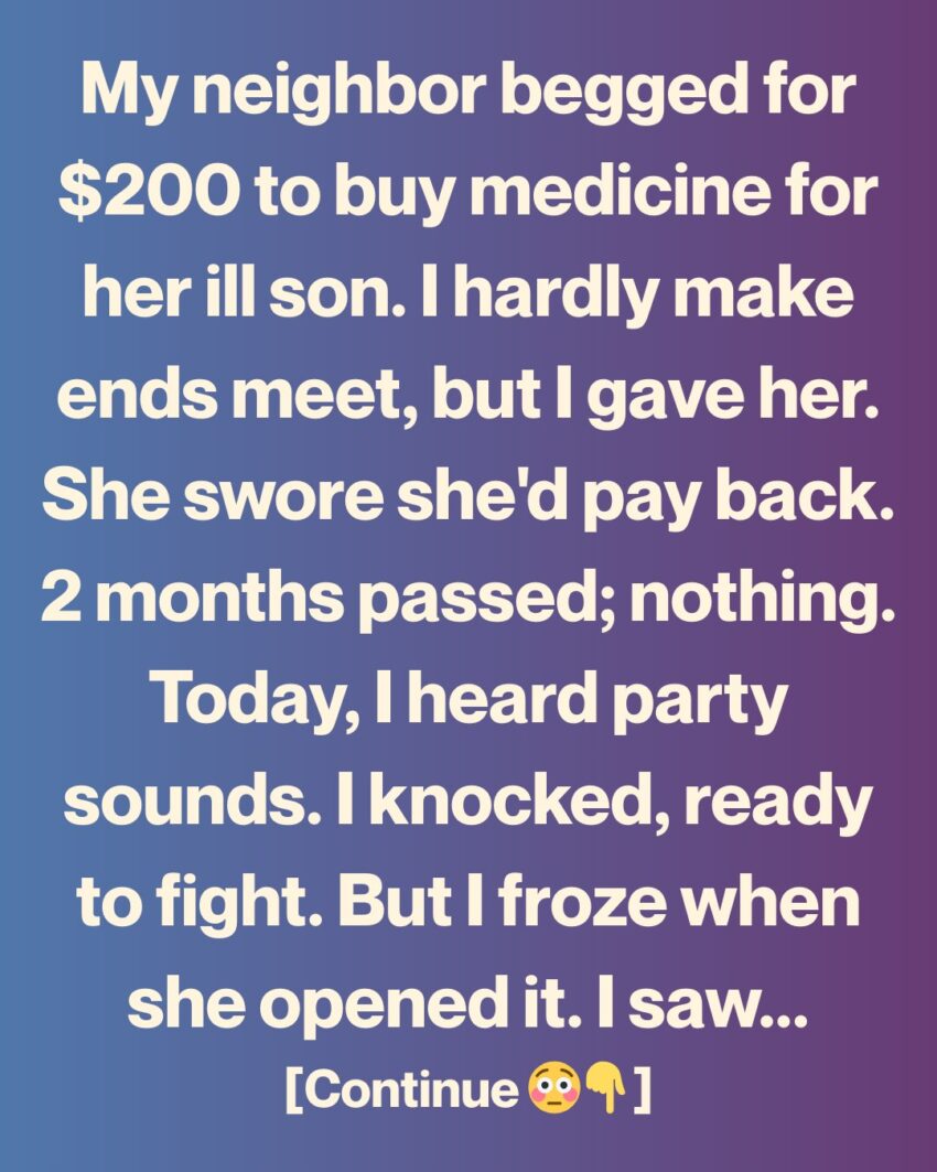 My neighbor knocked on my door two months ago, her face blotched from crying, her voice barely steady. She begged me for $200—money she needed to buy medicine for her sick son. I don’t have much myself; some weeks I’m counting coins just to get through. But the desperation in her eyes made the decision for me. I handed her the money, and she gripped my hands, swearing she’d pay me back the moment she could.