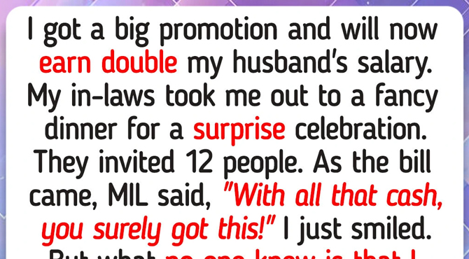 I got a big promotion and will now earn double my husband’s salary. My in-laws took me out to a fancy restaurant for a surprise celebration. There were 12 people.