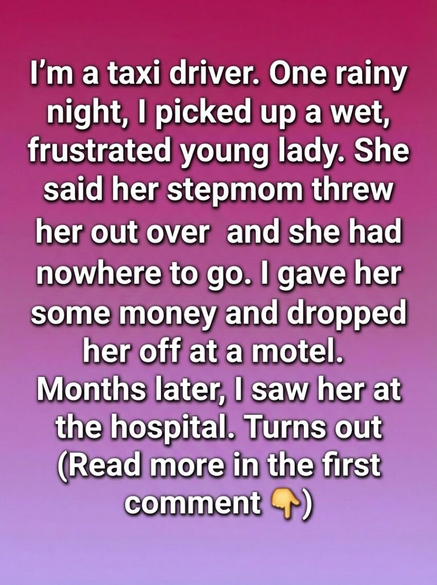 Rain had a way of revealing truths people tried to hide, and that night it revealed hers. I was nearing the end of my shift when I saw her standing under a flickering streetlight, soaked to the bone and hugging herself for warmth. Something about her expression—equal parts frustration and fear—made me stop. During the ride, she told me her stepmother had thrown her out after a bitter argument, leaving her with no place to sleep. She spoke with forced composure, but her trembling hands betrayed her. I didn’t ask too many questions; sometimes people need kindness more than curiosity. I handed her a few bills I could spare and dropped her at a modest motel, hoping that gesture would buy her a little safety and time to breathe.