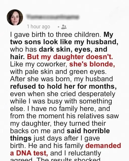 Like my coworker, she’s blonde, with pale skin and green eyes. After she was born, my husband refused to hold her for months, even when she cried desperately while I was busy with something else. I have no family here, and from the moment his relatives saw my daughter, they turned their backs on me and said horrible things just days after I gave birth.