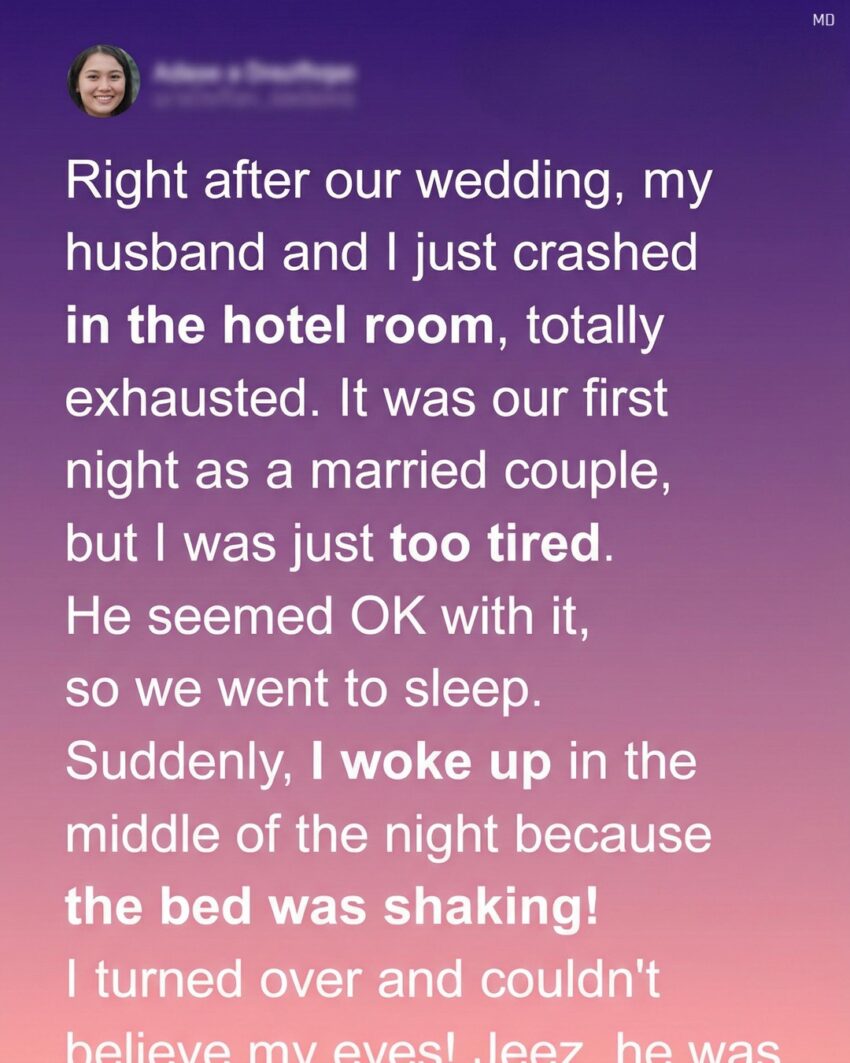 He wasn’t panicking. He wasn’t even fully awake. He was kneeling beside the bed, carefully adjusting one of the legs underneath the frame. Apparently, in our rush to collapse onto it earlier, we hadn’t noticed that one side of the bed was uneven. Every time one of us shifted, the frame wobbled against the wooden floor. Half-asleep and determined to “fix it like a responsible husband,” he had decided to handle it immediately rather than wait until morning. The shaking I felt was simply him trying to steady the frame without waking me.