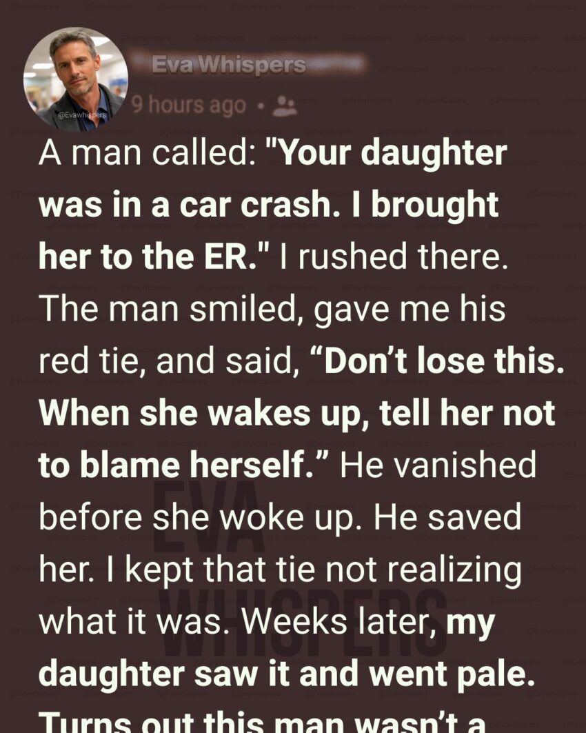The man approached me then. His eyes were steady, his smile faint but strangely reassuring. He reached into his pocket and pulled out a red tie, neatly folded. He pressed it into my hand. “Don’t lose this,” he said softly. “When she wakes up, tell her she did the right thing. Tell her not to blame herself.”