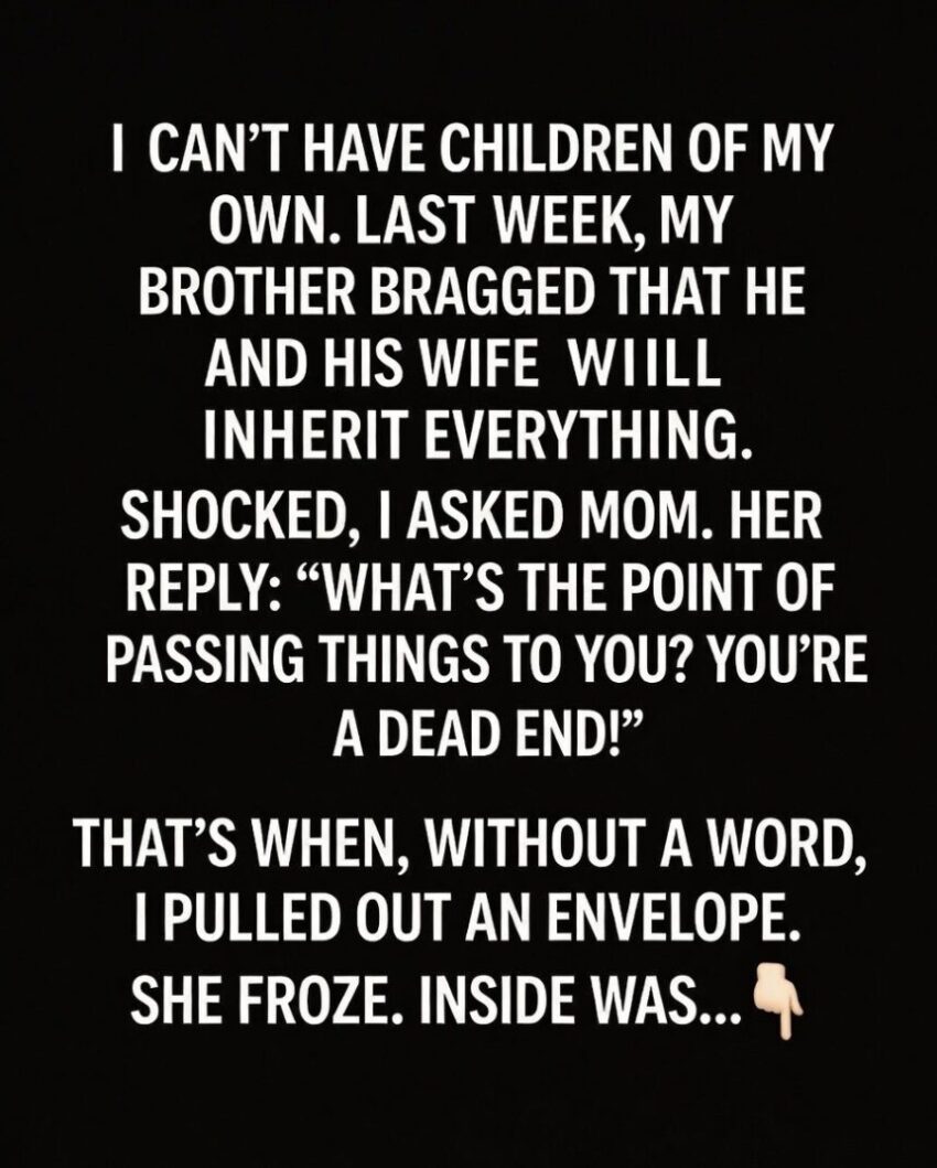 You’re the end of the line.”Those words stung deeply. For a moment, it felt like the ground had been pulled out from beneath me. I wasn’t just being excluded from an inheritance—I was being told I didn’t count, that my life had less value because I couldn’t have children naturally.I sat in silence, holding back tears.