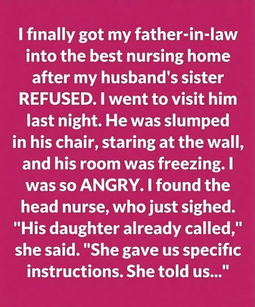 After my husband passed away, I was the one who ensured my father-in-law received proper care—something his daughter, Diane, consistently avoided. When I visited him at the nursing home one evening, I found his room unbearably cold. The staff explained that Diane, listed as his medical proxy, had ordered the heat kept low to reduce costs. He suffered from severe arthritis and whispered “cold” when I asked how he felt. That night, I brought blankets, a space heater, warm socks, and stayed by his side. When I learned Diane had even tried to block my visits, I began documenting everything—room temperatures, staff notes, his physical condition. With the help of a lawyer, I petitioned to challenge her proxy status. The turning point came when a voicemail surfaced in which Diane stated she was “tired of paying” and indifferent if he passed soon. In court, my father-in-law clearly said he wanted me making decisions because “she’s the one who comes.” I was granted medical proxy, and Diane was removed.