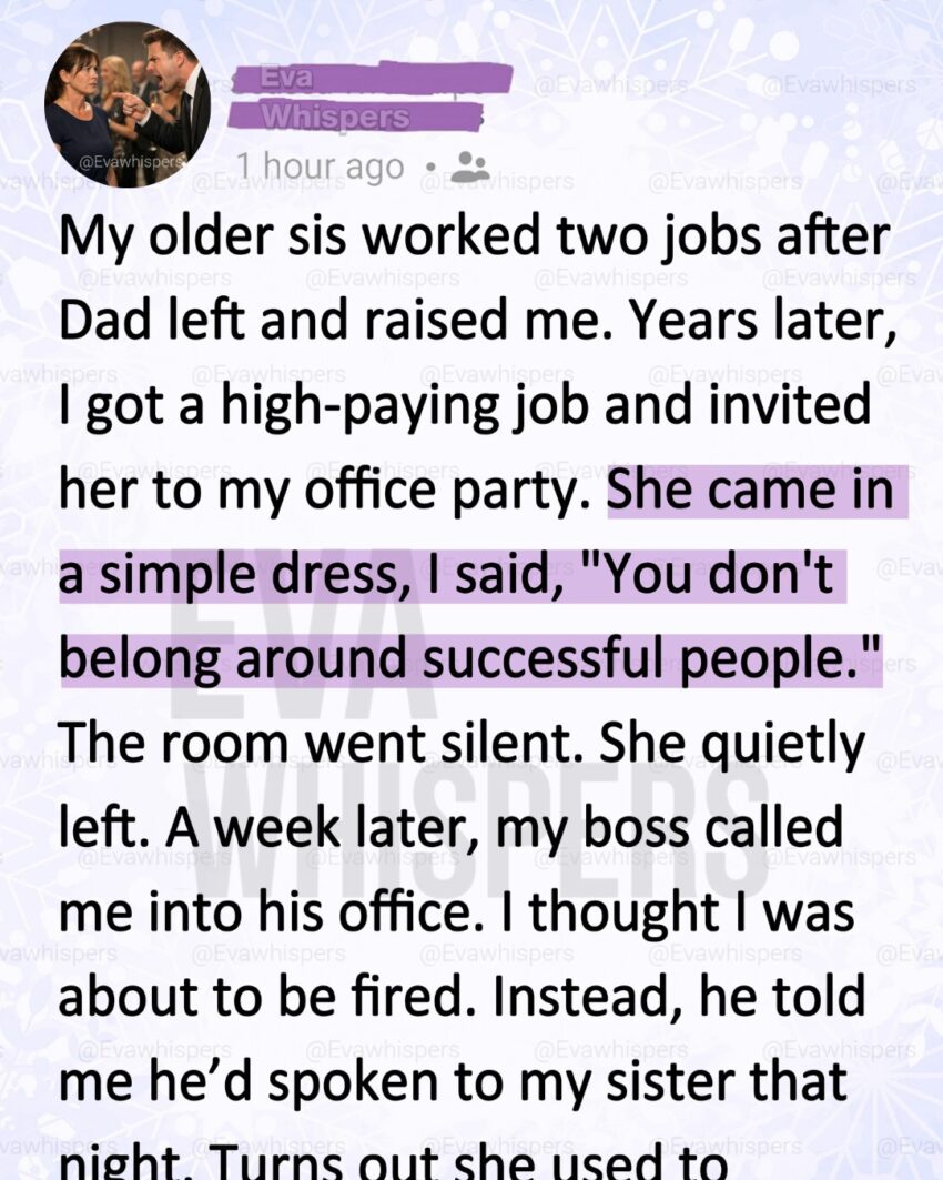 Years later, I landed a high-paying job at a prestigious firm downtown. Corner office. Impressive title. Executive parties with people who wore tailored suits and spoke in polished voices.