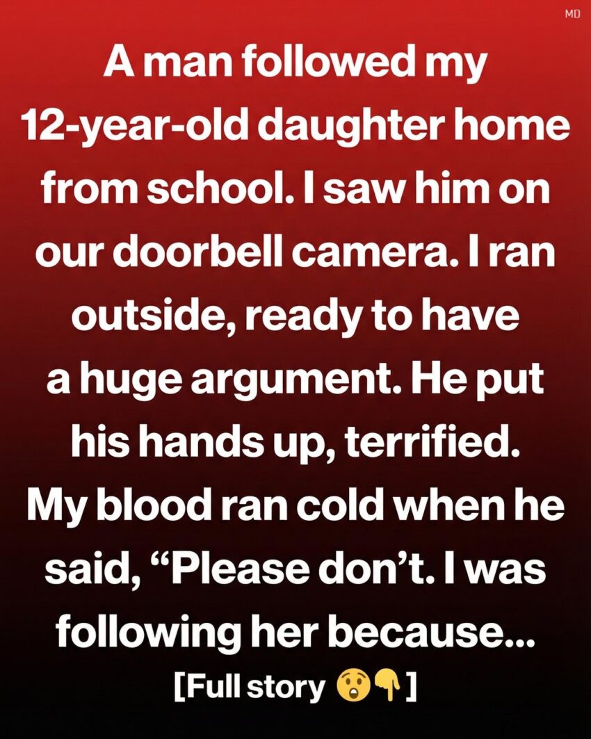 Late one afternoon, my 12-year-old daughter walked home from school the same way she always did—down the quiet neighborhood street lined with small trees and familiar houses. I was inside finishing a few chores when my phone buzzed with a motion alert from our doorbell camera. Curious, I opened the app and saw her walking toward the house. But a few steps behind her was a man I didn’t recognize. My heart began to race. I hurried outside, ready to confront him, my mind filled with protective worry.