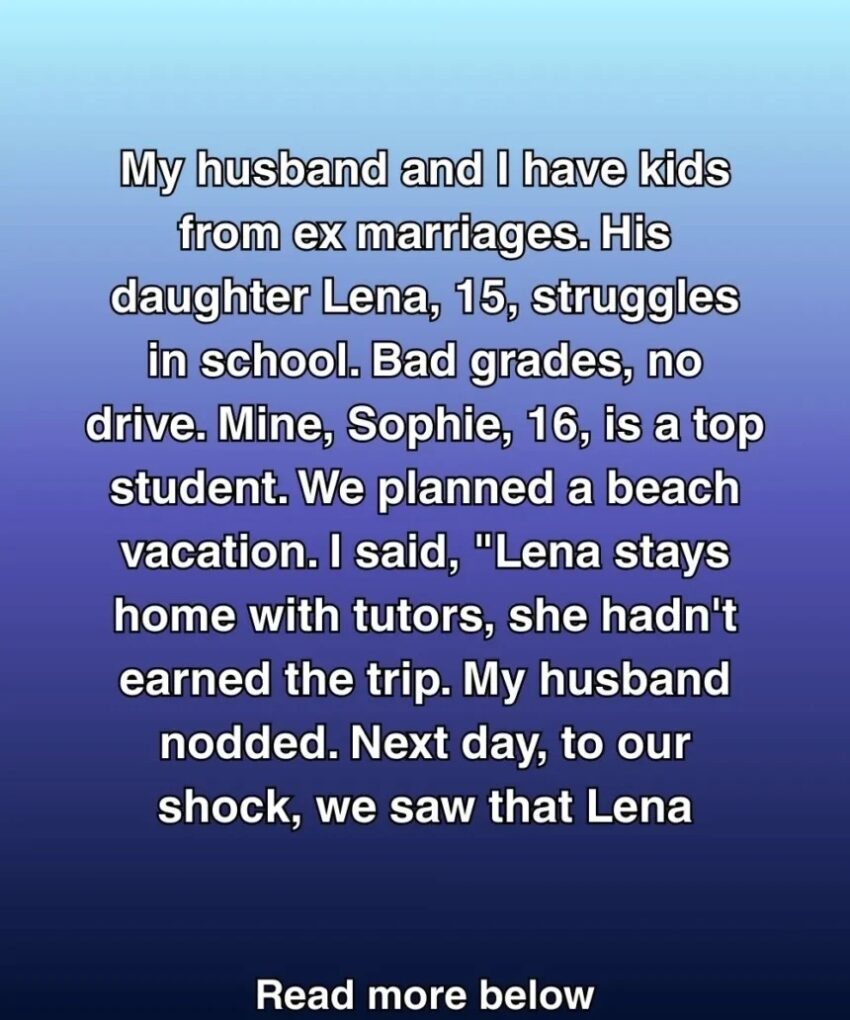 Mine, Sophie, 16, is a top student. We planned a beach vacation. I said, “Lena stays home with tutors, she hadn’t earned the trip.” My husband nodded.