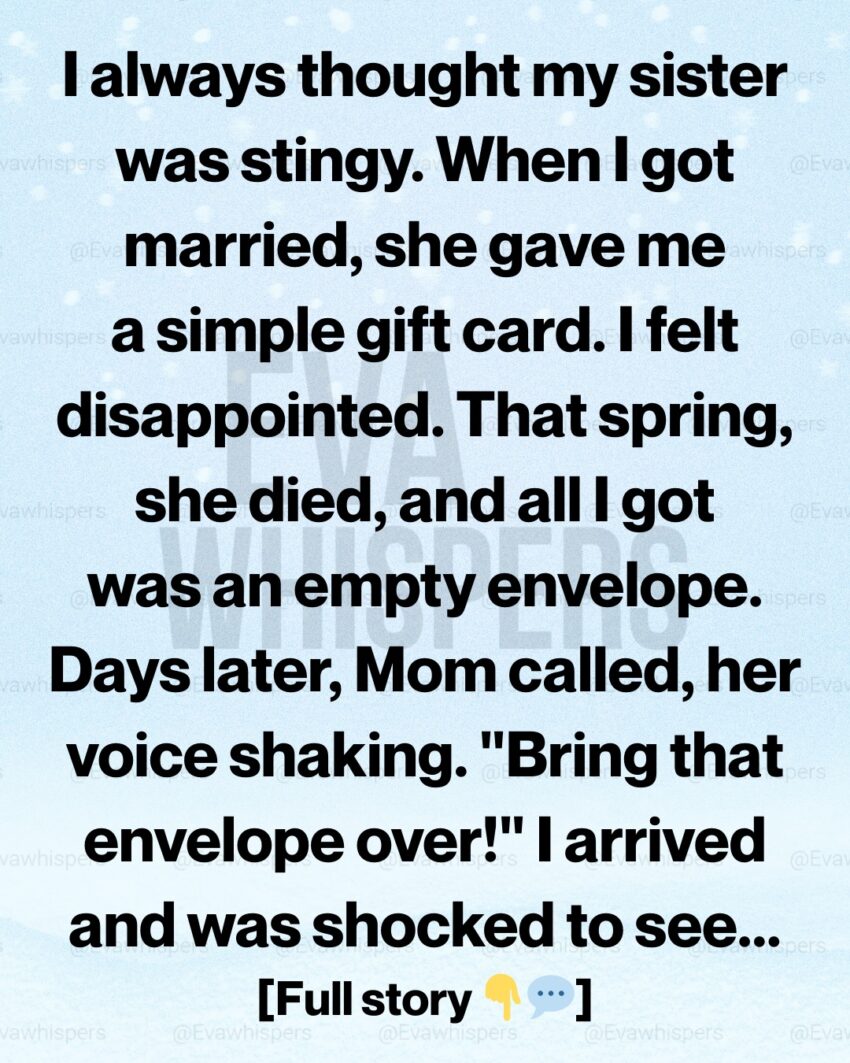 “Your sister asked me to give you this if anything ever happened,” she said gently, handing me an envelope.