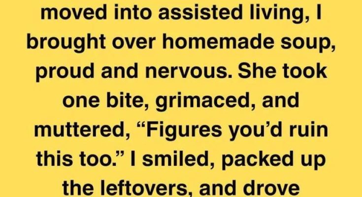 Mom never let me cook growing up—she said I’d ruin her kitchen. Years later, after she moved into assisted living, I proudly brought her homemade soup. She tasted it, grimaced, and muttered, “Figures you’d ruin this too.” I smiled, but inside I broke.