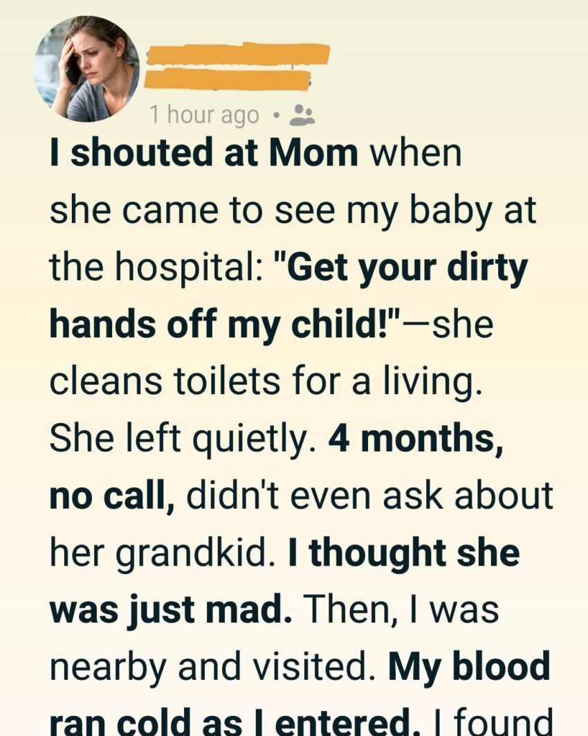 At the time, I felt justified. Exhausted. Overwhelmed. Ashamed in ways I didn’t know how to name. My mother cleaned toilets for a living—office buildings, train stations, anywhere that needed someone invisible to scrub away other people’s messes. I had spent years pretending that didn’t bother me. But there, in that pristine hospital room, holding my perfect baby, all my buried resentment spilled out in one unforgivable sentence.