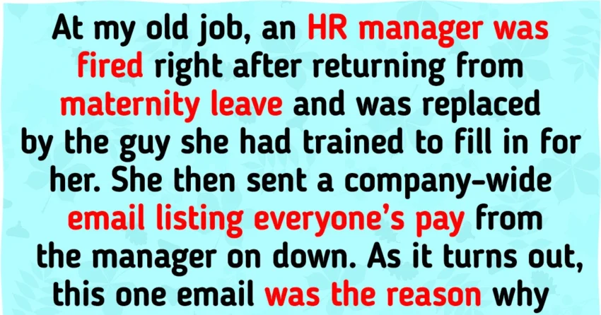 - At my old job, an HR manager was fired right after returning from maternity leave and replaced by the guy she had trained to fill in for her while she was gone. She then sent a company-wide email listing everyone’s pay, from the plant manager on down.