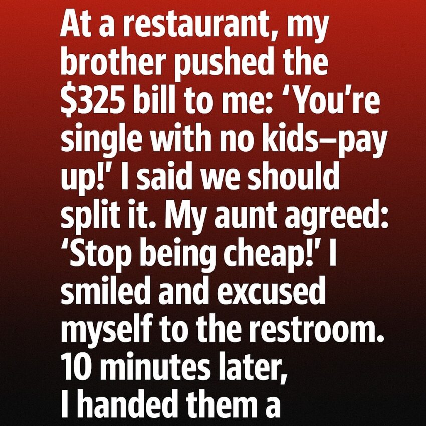 The evening began like many family dinners do—warm, lively, and full of conversation. We gathered around a large table at a busy restaurant, sharing stories, laughing about old memories, and enjoying the comfort of being together. Glasses clinked, jokes bounced from one person to another, and the atmosphere felt easy and relaxed. But when the server placed the check on the table, the mood shifted in an unexpected way. My brother casually slid the bill toward me and joked that since I was single and didn’t have children, I should cover the entire amount. A few relatives laughed along, assuming it was a harmless comment. I smiled politely, but inside I realized something important. Instead of debating or creating tension at the table, I quietly excused myself and stepped away for a few minutes.