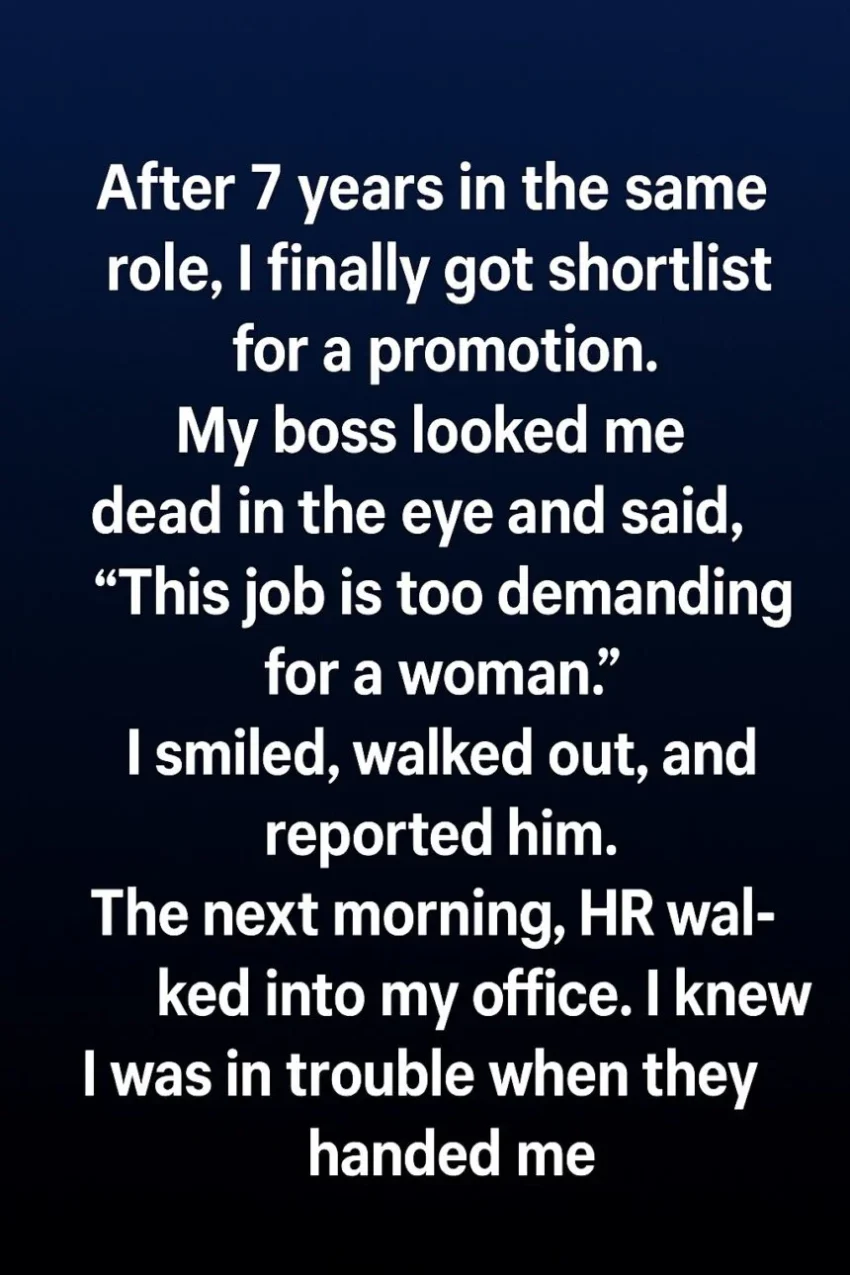 After seven years of dedication in the same role, I finally received news that I had been shortlisted for a long-awaited promotion. I walked into the meeting with hope, ready to show how far I had grown. Instead, my boss looked me straight in the eye and told me the job was “too demanding for a woman.”