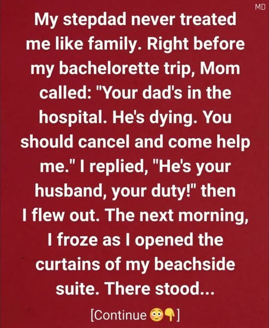 The message from my mother came just as I was finishing the final details for my bachelorette trip. My suitcase sat open on the bed, half-filled with beach clothes and excitement for the days ahead. Then my phone rang. Her voice sounded tired, almost trembling. She told me my stepfather was in the hospital and that his condition was serious. For a moment I was silent, unsure what to say. Our relationship had always been distant. He had been part of my life for years, but I had never truly felt like I belonged in his world. After a long pause, I told my mother that she should stay with him and that I would continue with my plans. The words felt firm at the time, almost protective of the emotional distance I had built over the years.