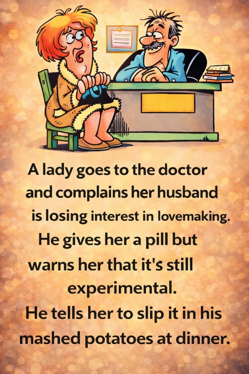 At dinner that night, she does just that.About a week later she’s back at the doctor and tells him, “The pill worked great! I put it in his mashed potatoes like you said.