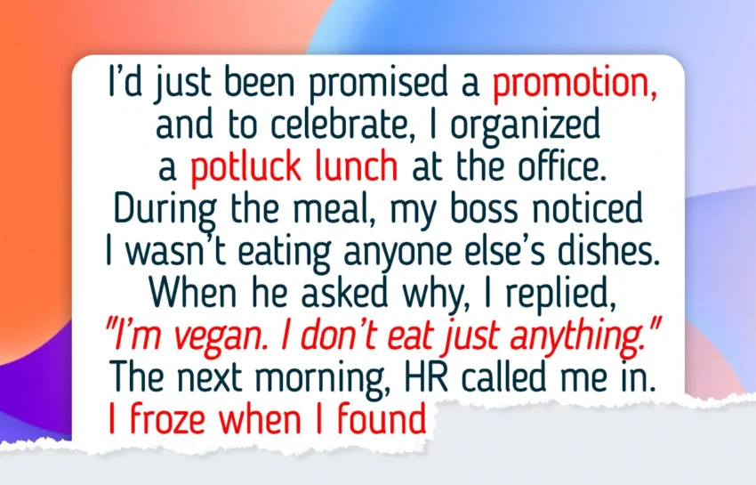 I work for a firm that specializes in marketing and branding. I’d just been promised a promotion, and to celebrate, I organized a potluck lunch at the office. During the meal, my boss noticed I wasn’t eating anyone else’s dishes. When he asked why, I replied, “I’m vegan. I don’t eat just anything.”