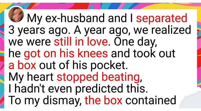 Amy goes on with her story, saying, «So, we divorced 3 years ago and I avoided any contact with Dan for a very long time. I did receive some invitations for a cup of coffee from him, but I ignored every attempt of Dan to get closer again. But around one year ago, we accidentally met in a supermarket. I went to buy some groceries and he was there, too, accompanied by some beautiful lady.»