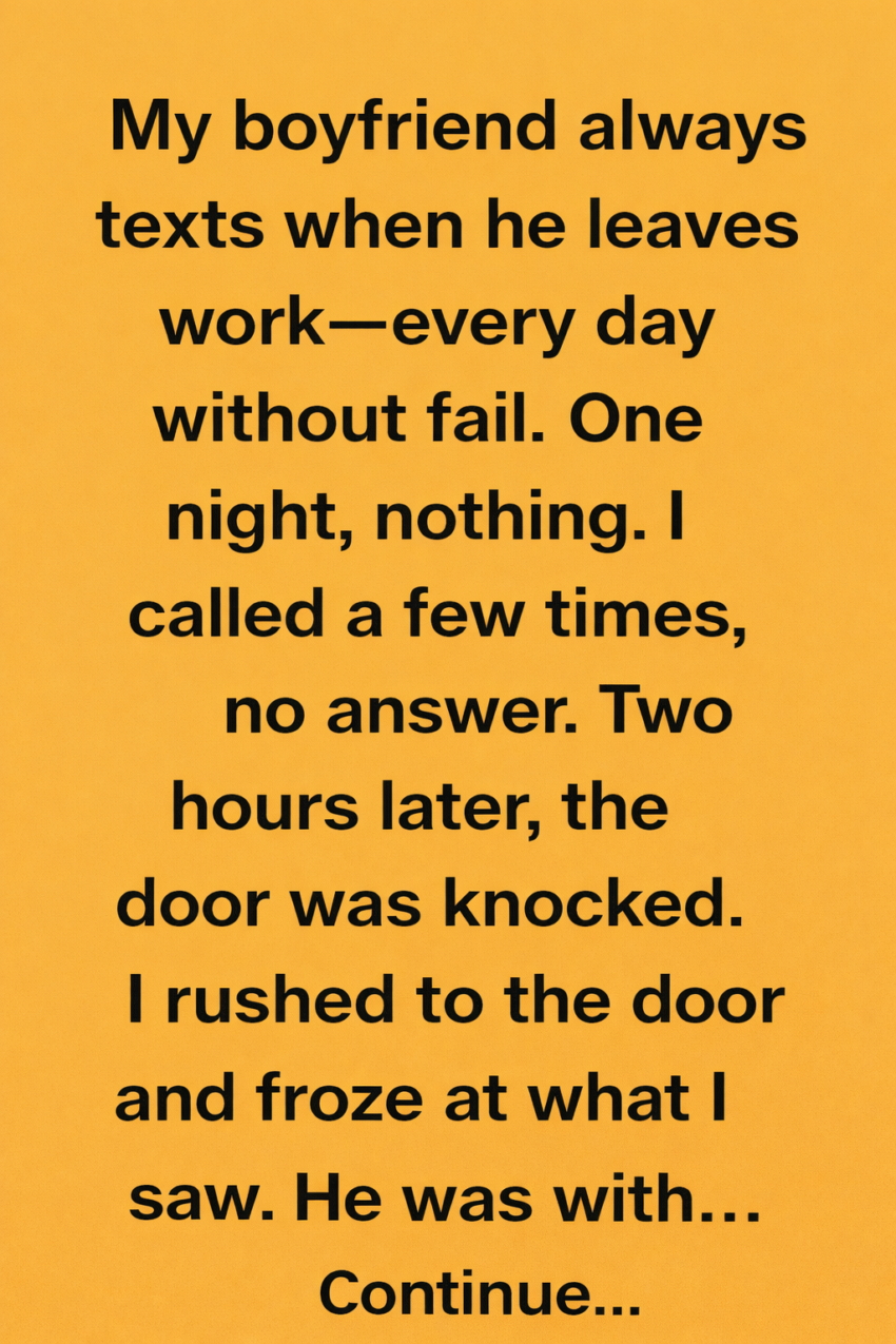 My boyfriend always texted when he left work—every day without fail. One night, nothing. I called a few times, no answer. Two hours later, there was a knock at the door.